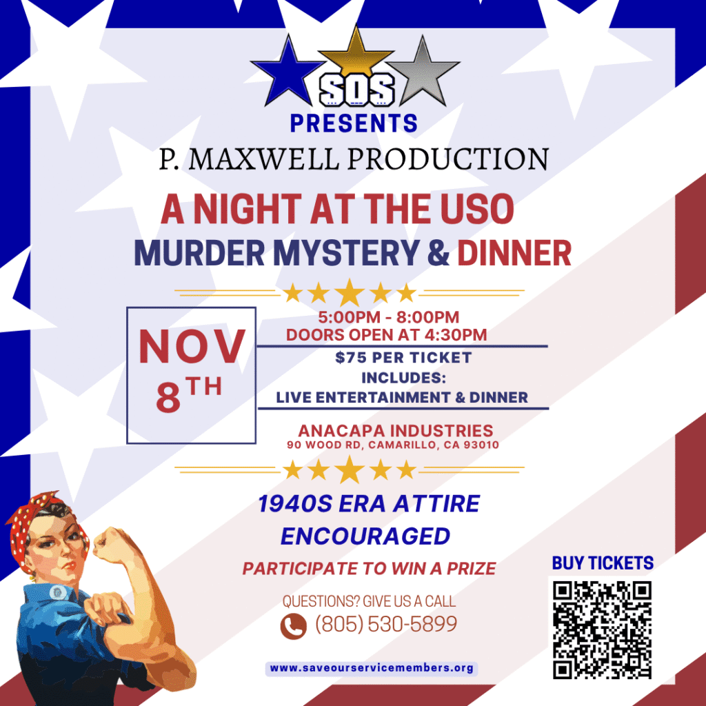 Join Save Our Servicemembers November 8th from 5:00PM – 8:00PM for our annual fundraiser. This year, we are excited to partner with P. Maxwell Productions for a Murder Mystery and Dinner.